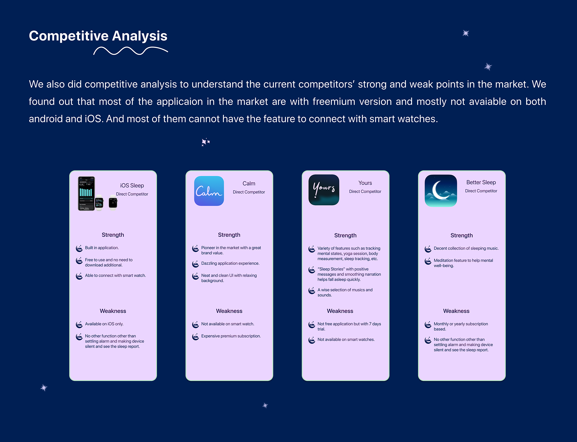 Magic sleep is an app that can help users to improve sleep quality and sleep routine because we wanted to help people to have fully energetic days which can help them deal with their stress. Magic Sleep is an entrepreneur's contract project. The prompt of the stakeholder is to develop the design solutions for mental health application. This project was the collaboration with 4 amazing talented designers. I take initiative leading on the UX design process in this project by crafting the research framework, questionnaires and organized the brainstorming session to find the design solution.